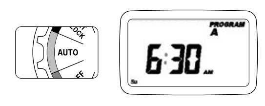 Reset the timer, set the clock and date, choose Program A or B, set a start time, set run times for each station, then choose “How Often” (days, interval, or odd/even). Finally, set the dial to AUTO. That’s it.