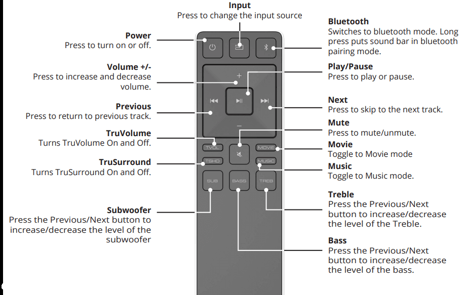 - Bluetooth Button – Pairs the soundbar with a Bluetooth device.